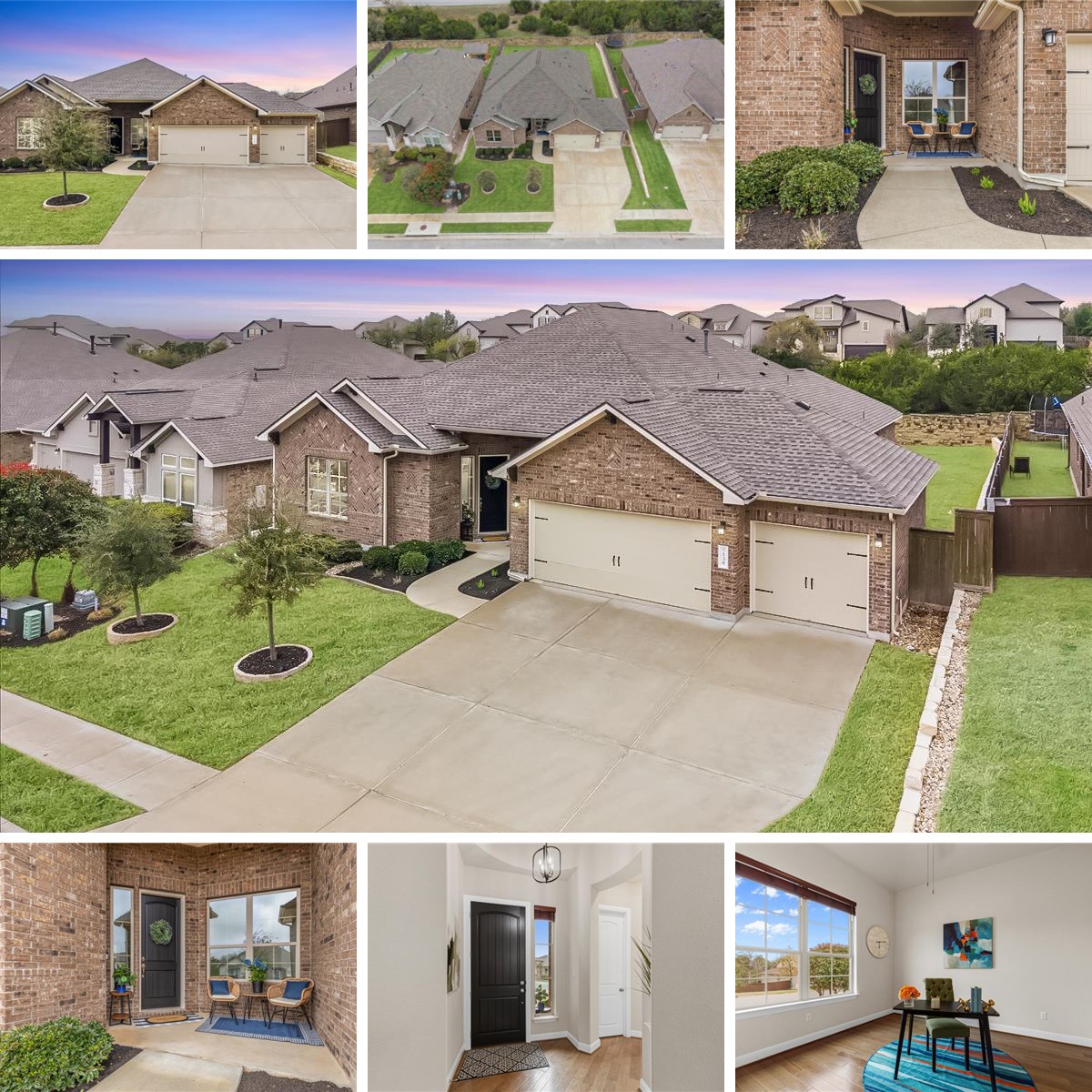 Beautifully maintained and move-in ready, this Scott Felder single-story home located on a cul-de-sac street in highly sought-after Belterra offers the rare convenience of no interior steps or stairs, a flat lot, and a thoughtfully designed layout for comfortable everyday living. Featuring 3 bedrooms, a dedicated office, 2.5 baths, and a 3-car garage, this home combines functionality and exceptional livability. The front porch creates a warm welcome, while the expansive 28' x 22' covered back patio offers outstanding outdoor living space for relaxing, entertaining, or enjoying the peaceful backyard setting. Inside, wood floors run throughout the home except in the bathrooms, creating a seamless and upscale feel. The spacious primary suite is privately situated and enhanced by an extended sitting area with a bay window. The luxurious primary bath includes dual vanities, a large walk-in shower, garden tub, and an oversized walk-in closet with built-ins. Belterra is located in highly acclaimed Dripping Springs ISD, a highly regarded and award-winning school district. This is an exceptional opportunity to own a move-in ready single-story home on a flat lot in one of Austin's most popular master-planned communities. This amazing neighborhood is zoned for Dripping Springs ISD exemplary-rated schools. Rooster Springs Elementary is located within the neighborhood just a short 5 minute walk from this home. Sycamore Springs Middle School is a 5-minute drive. This home is walkable to the trails, parks, duck ponds, splash pad, community pool and gym. Belterra Village shopping center at the entrance of Belterra features many specialty stores, restaurants. The HEB is 5 minute drive. The community pool is a gathering spot in the summer hosting the Belterra Marlins swim team for kids ages 4 to 18. Belterra has planned social activities every week. It also has over 15 miles of walking/jogging/biking trails that run throughout the neighborhood.